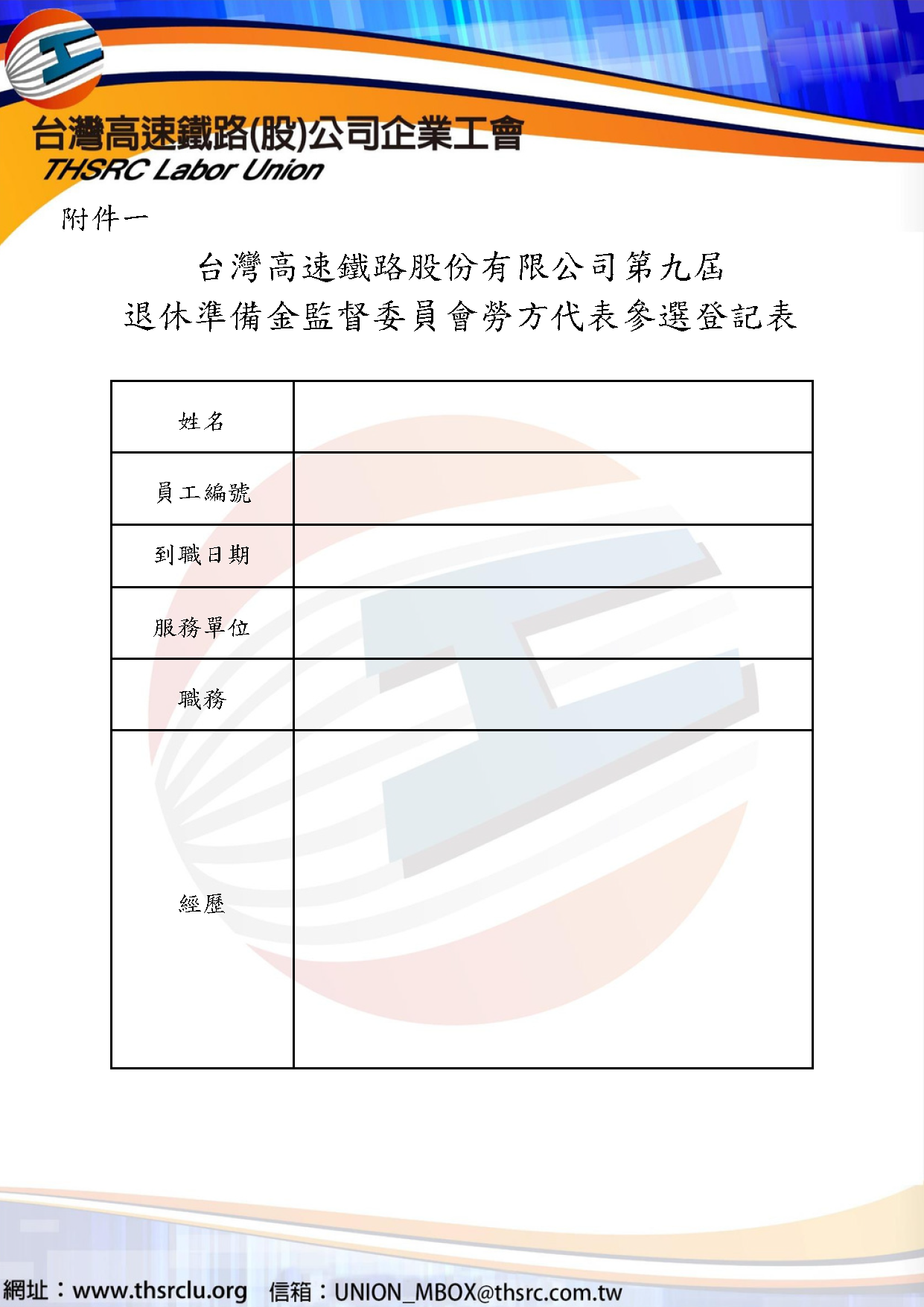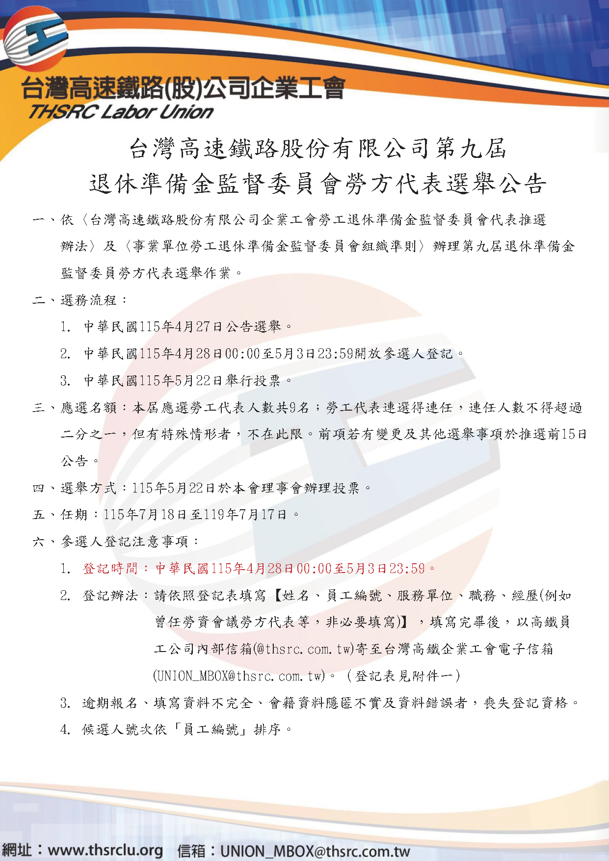 News 最新消息 2026-04-27 ❗️❗️❗️ 第九屆台灣高速鐵路股份有限公司勞工退休準備金監督委員會勞工代表_選舉公告❗️❗️❗️ 115年4月28日00:00至5月3日23:59開放參選人登記 參選登記表單下載 點我 115年5月22日舉行投票 115年4月28日00:00至5月3日23:59開放參選人登記 參選登記表單下載 點我 115年5月22日舉行投票 返回列表